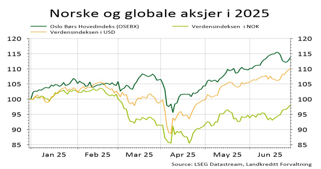 Figur 2: Kursutvikling for norske aksjer (OSEBX) og globale aksjer (Verdensindeksen - MSCI AC World målt i amerikanske dollar og norske kroner) for 1. halvår 2025. Seriene er rebasert til 100 pr. 1/1-2025