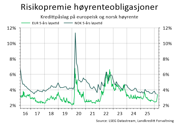 Figur 1: Risikopremie på høyrenteobligasjoner i Europa og Norge. Data hentet fra LSEG Datastream og Landkreditt Forvaltning.