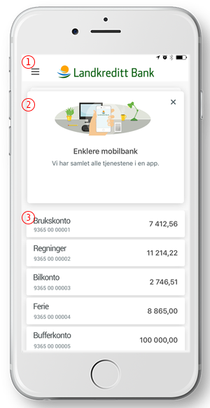 Mobilbankens forside består av 3 elementer.